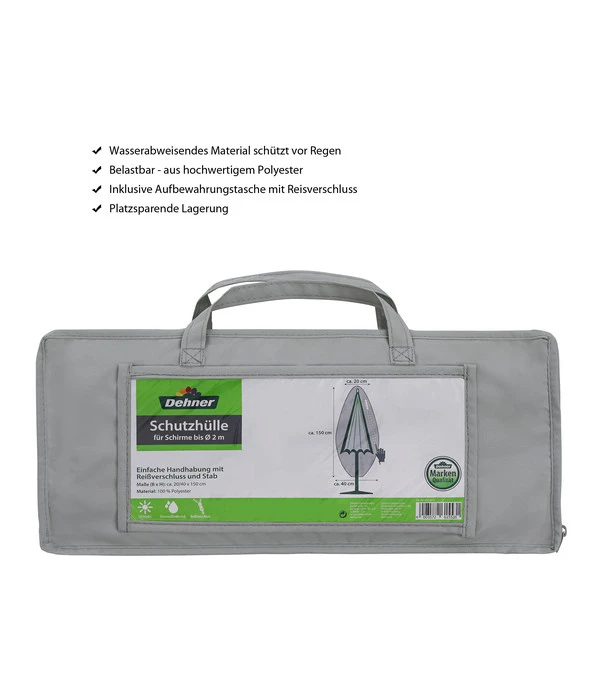 Dank eines mitgelieferten Hilfsstabs gestaltet sich die Handhabung des Must-haves für Ihren Sonnenschutz problemlos, was insbesondere bei hohen Gartenschirmen sowie bei täglicher Nutzung von Vorteil ist. Mithilfe der Stange können Sie das Aufsetzen bzw. Abnehmen der Schutzvorrichtung auch alleine gut bewerkstelligen, ohne Hilfsmittel in Anspruch nehmen zu müssen. Die mit einem praktischen Reißverschluss versehene Dehner Abdeckhaube für Schirme punktet nicht nur in funktionaler Hinsicht. Auch optisch überzeugt das hochwertige Zubehör auf ganzer Linie: Dezent in der Farbgebung, puristisch im Design, passt sich die Hülle in ihre Umgebung ein, ohne als störend wahrgenommen zu werden. Damit Sie sich noch lange an Ihrem Sonnenschirm erfreuen können, sollten Sie ihn schnellstmöglich unter die Abdeckhaube für Schirme von Dehner bringen.