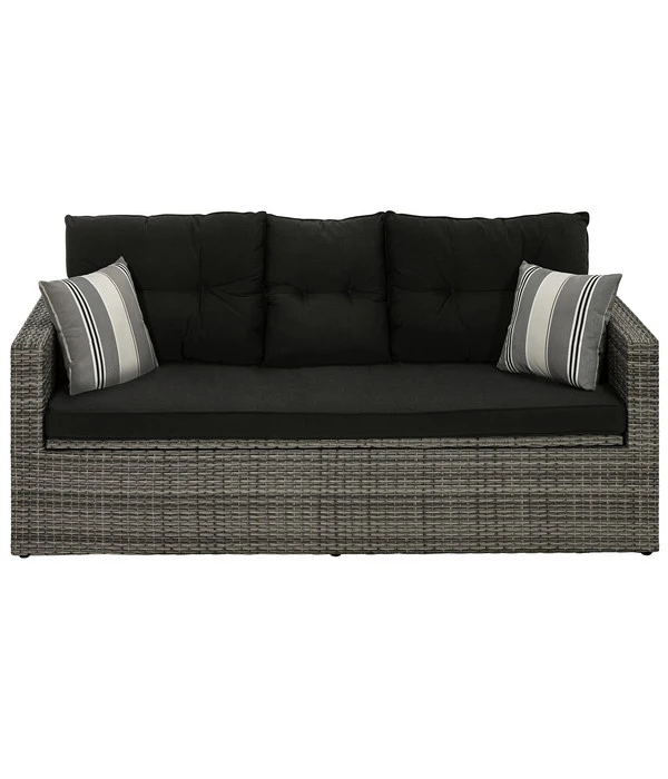 Wie schön, dass es jetzt Gartenmöbel gibt, die den gleichen Komfort bieten wie die Indoor-Möbel. Und die mit dem gleichen hohen Anspruch an Design und Qualität gefertigt werden, aber zugleich mit bester Wetterfestigkeit punkten. Und obwohl diese vielen Pluspunkte inzwischen auf viele Gartenmöbel zutreffen, freuen wir uns, Ihnen mit der Dehner Flecht-Truhenbank ‘Föhr‘ ein ganz besonderes Modell vorstellen zu können. Ein Loungesofa, das Sie mit einem Komfort verwöhnen wird, den so manches Indoor-Sofa nicht hat. Lassen Sie sich bald in jeder freien Minute auf Ihr neues Gartensofa sinken und spüren Sie, wie die vielen Polster und Kissen Sie wunderbar weich umfangen und Ihnen die Stunden versüßen. Mit einer stattlichen Breite von 188 cm bietet die Dehner Flecht-Truhenbank ‘Föhr‘ bequem bis zu 3 Sitzplätze; sind Sie allein, können Sie sich aber auch lang darauf ausstrecken und ein kleines Nickerchen machen. Und ist schlechtes Wetter angesagt, verstauen Sie einfach die Polster und Kissen in dem Raum unter der Sitzfläche. Lassen Sie jetzt die Dehner Flecht-Truhenbank ‘Föhr‘ Ihren Sommer noch schöner machen!