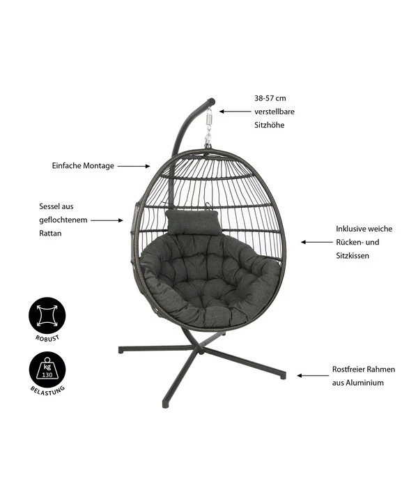 Sie schätzen ansprechende Möbelstücke und lieben es, sanft hin- und hergeschaukelt zu werden? Dann ist der schicke, puristisch gestaltete Sungörl Hängesessel Folt Meran genau das Richtige für Sie. Die aparte Sitzgelegenheit hat einen stabilen, rostfreien Rahmen aus Aluminium, der mit einem Rattangeflecht ummantelt ist. Dank der überaus bequemen Polsterung aus Polyester macht man es sich gerne im Hängesessel gemütlich. Mit bis zu 130 kg kann das robuste pulverbeschichtete Stahlrohrgestell belastet werden, sodass auch stattliche Personen einen gemütlichen Platz zum Verweilen vorfinden. Je nach Bedarf lässt sich der Hängesessel Folt Meran von Sungörl im Innen- oder im Außenbereich nutzen. Im letzteren Fall empfiehlt es sich, den Sessel vor Witterungseinflüssen zu schützen.